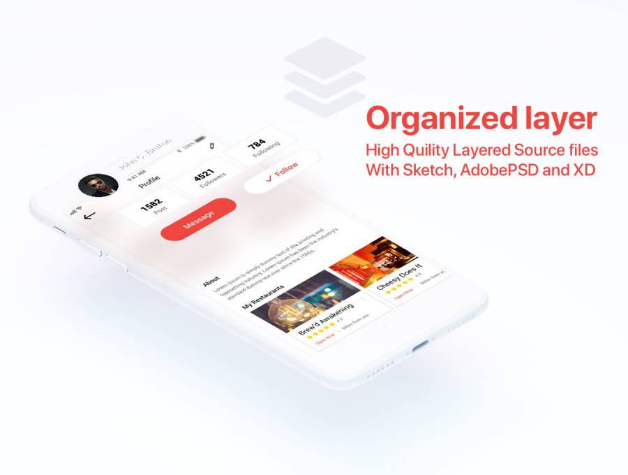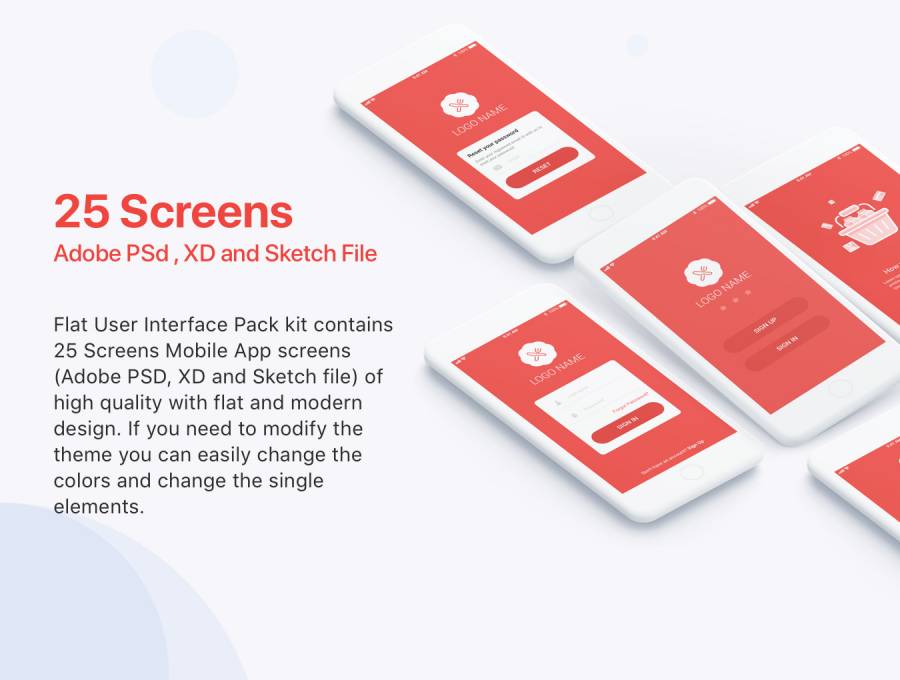 平面用户界面包套件包含25个高质量的屏幕移动应用程序屏幕(Adobe PSD,XD和Sketch文件),平面和现代设计。如果您需要修改主题,您可以轻松更改颜色并更改单个元素。请注意,所有库存图片仅为展示占位符,未获得使用许可。