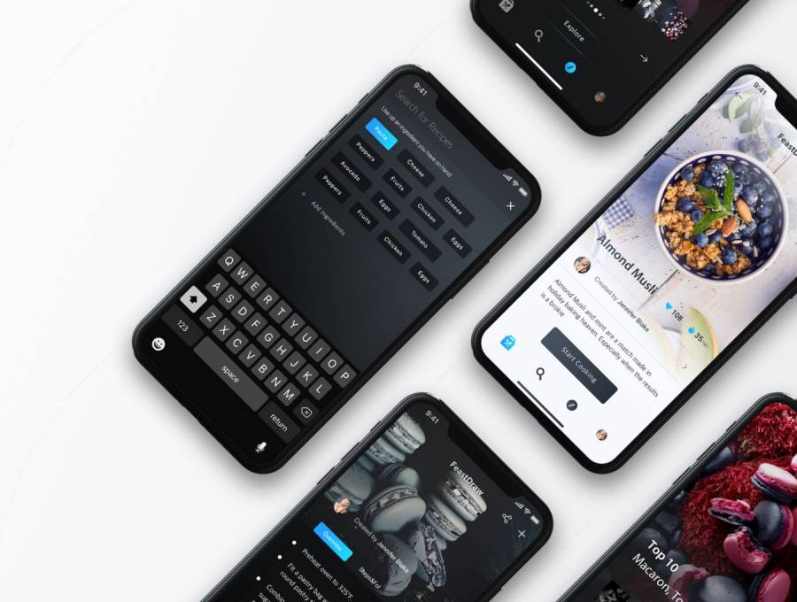 在Sketch。,FeastDraw UI Kit中设计的浅色和深色iOS Recipe UI工具包