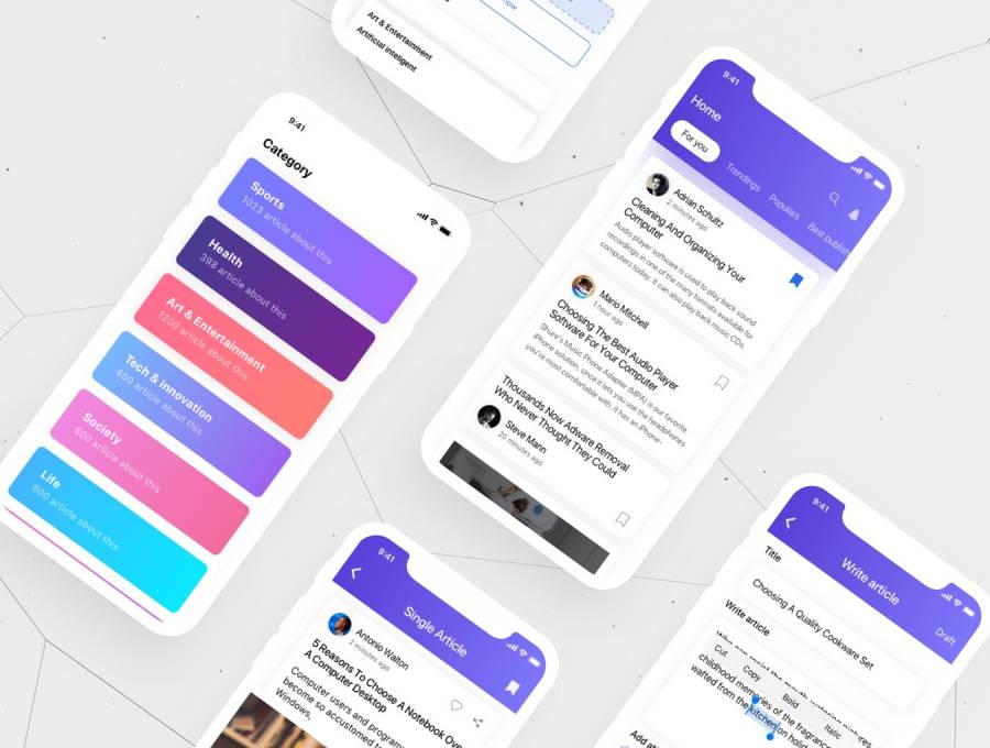 清洁设计,内容丰富。包括38 + iPhone X iOS屏幕,具有不同的文章风格图像,视频和音频帖子。新闻UI工具包还包括主要屏幕的黑暗版本。兼容Sketch,Adobe Photoshop,XD和Figma。