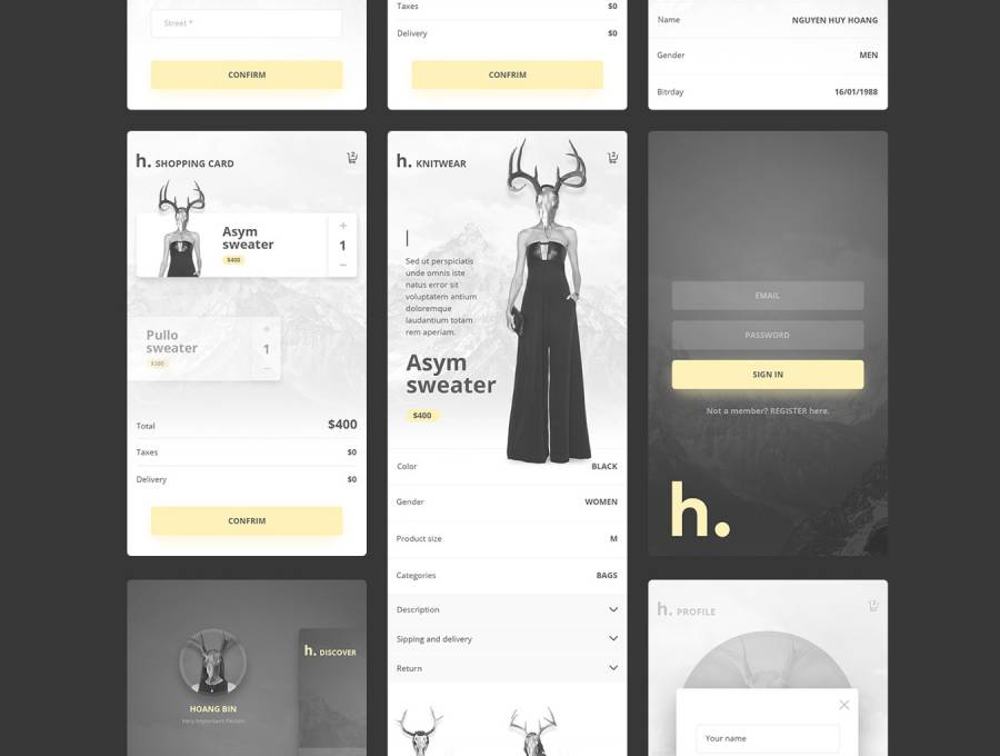 14屏幕时尚移动应用程序素描,XD和PSD,Hobi时尚应用程序设计