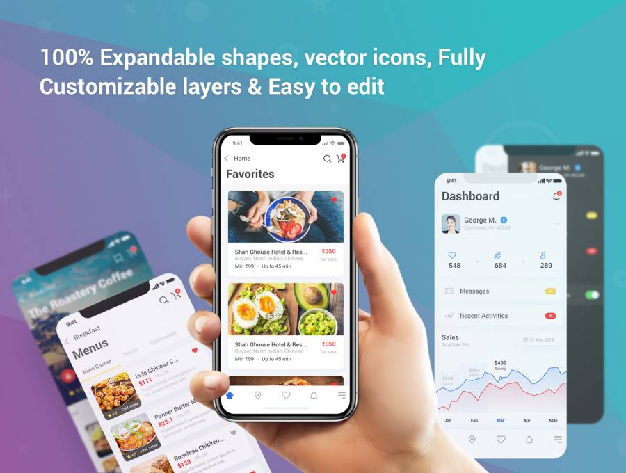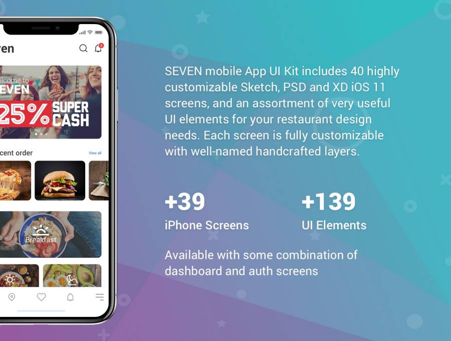 SEVEN移动应用UI工具包包括40个高度可定制的Sketch,PSD和XD iOS 11屏幕,以及各种非常有用的UI元素,可满足您的餐厅设计需求。每个屏幕都可以完全自定义,并且名称由手工制作。该套件设计简单,引人注目的iPhone X,包括+39 iOS屏幕模板。