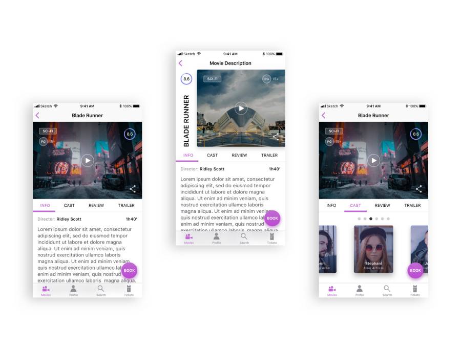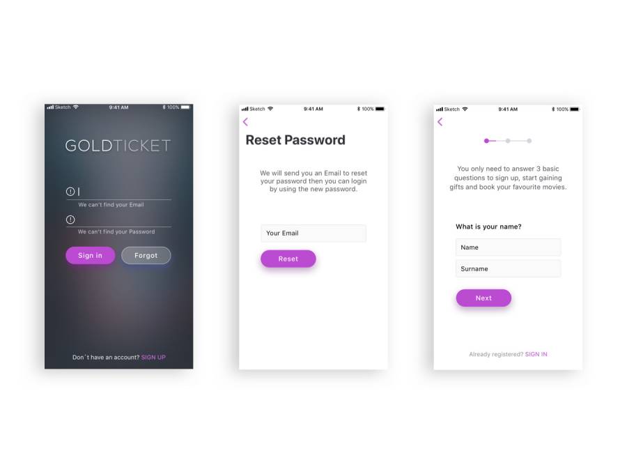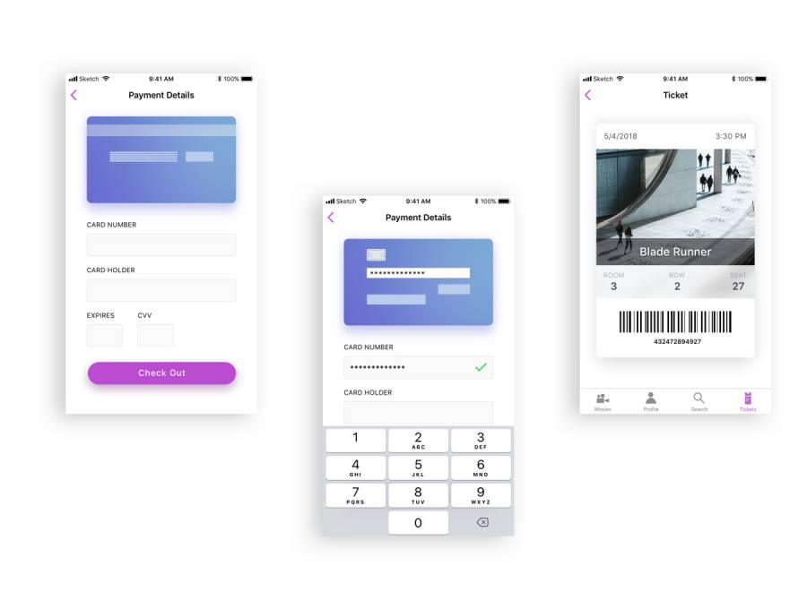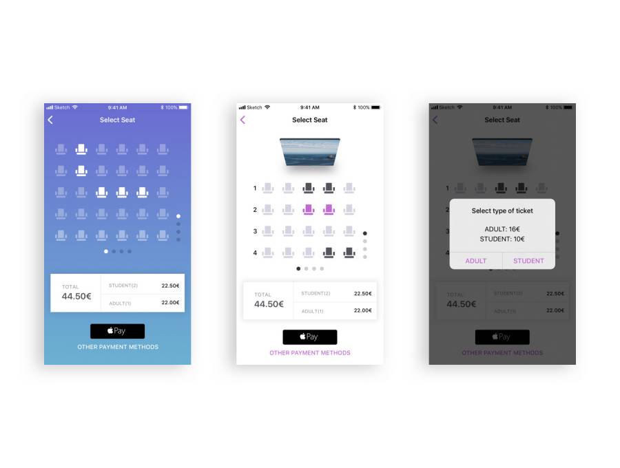 用于Sketch。,Gold Ticket UI Kit的移动iOS预订UI工具包
