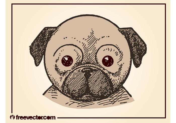 复古矢量图形的一个可爱的小狗。与大圆眼睛和下垂的耳朵的哈巴狗小狗的头部手绘制的布局。宠物免费矢量动物,家养动物,狗品种和兽医设计。 T恤打印和贺卡的小狗。