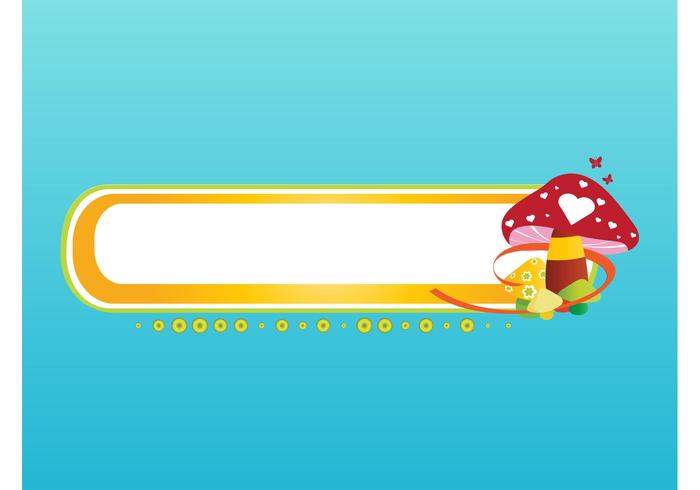 与横幅模板的矢量布局。与自然装饰的圆形横幅形状的明亮的彩色的卡通图形。与不同的大小和装饰的五颜六色的蘑菇。心,花和飞蝴蝶横幅创造自然,春天和动物视觉。