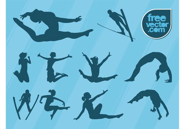 体育矢量素材的活跃的人。男人和女人跳跃和伸展的剪影。跳跃的滑雪者,快乐的人们在空中挥舞手,灵活的运动员和优雅的女人。免费矢量体育,积极的生活方式,体操,体育活动和健康的视觉效果。