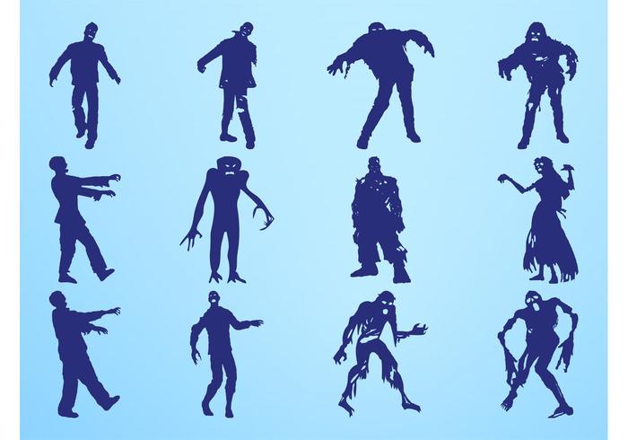 死亡和恐怖矢量素材的僵尸和怪物。腐烂的尸体和奇怪的生物的剪影,四肢和头部的不自然的位置,张开嘴巴和邪恶的表情。免费矢量僵尸启示录,怪物,死亡,万圣节和可怕的故事的视觉效果。