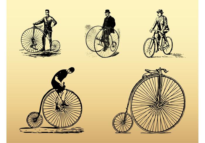 车辆和运输矢量图形的旧自行车。男子骑着复古自行车,人站在一辆普通的自行车旁边,停放着一分钱的自行车。免费矢量为您的老式海报,广告和传单。图形运输,自行车和骑自行车的视觉效果。