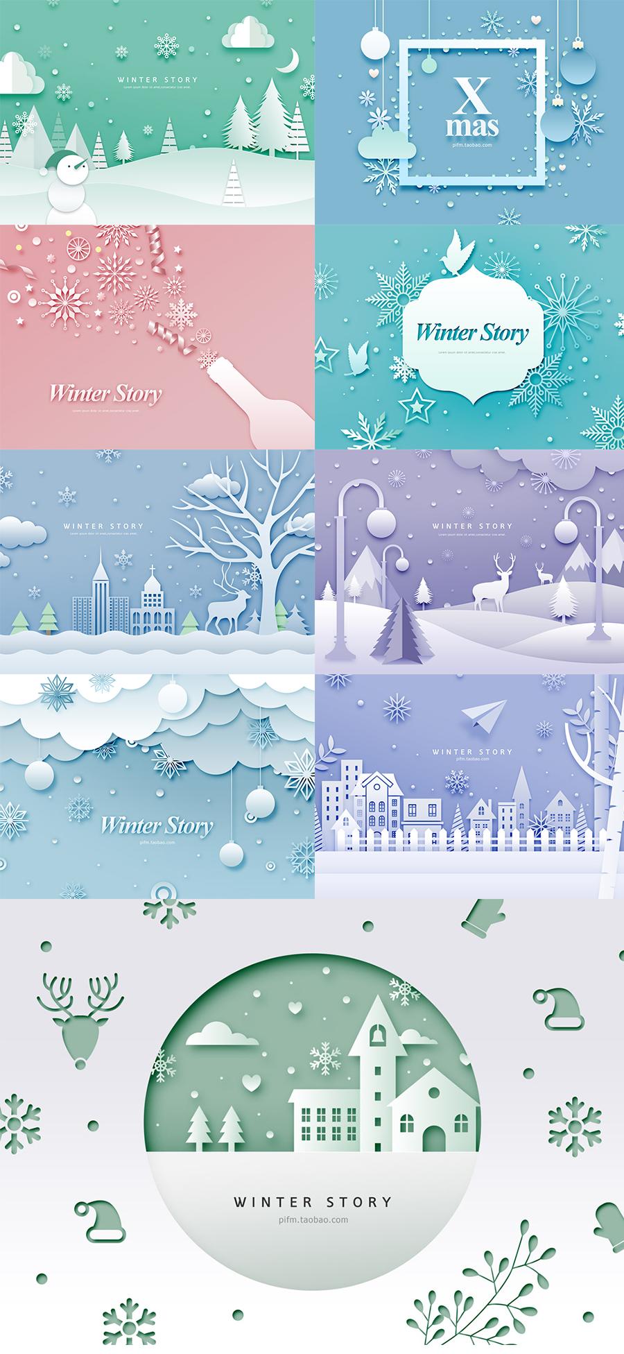 9款冬季剪纸贴画风格海报PSD素材源文件打包下载