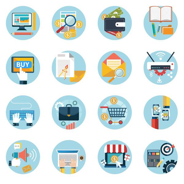 16款圆形商务元素图标矢量素材,电脑,放大镜,货币,铅笔,书本,手,网络购物,文件,键盘,公文包,购物车,圆规,钱包,无线路由器,喇叭,电脑,商铺,圆形,商务,图标,矢量图,EPS格式