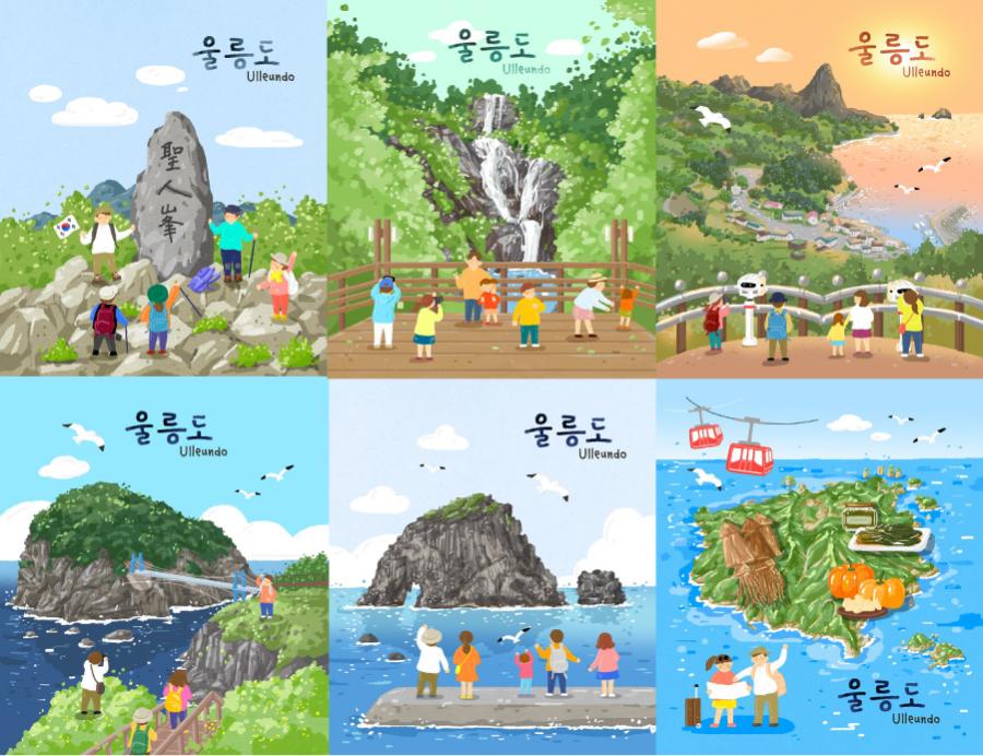 8款手绘旅游郊游爬山瀑布景点郁陵岛卡通春游PSD模板设计素材