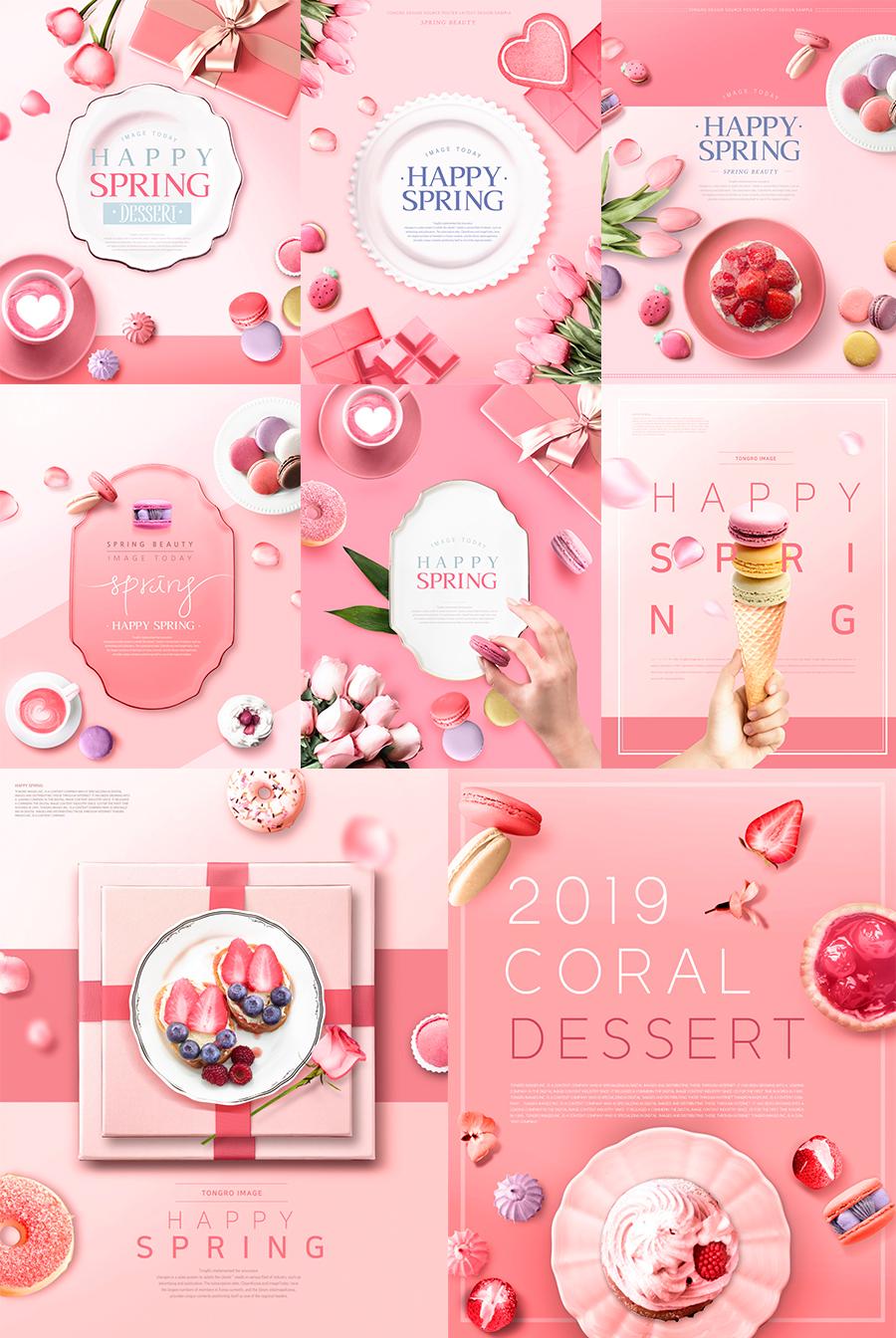 8款粉色主题美食卡布奇洛马卡龙玫瑰丝带礼盒海报PSD设计素材