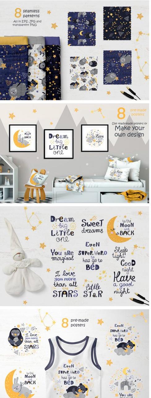 40款可爱儿童幼儿手绘卡通漫画睡觉绵羊插画产品包装图PNG素材AI矢量源文件