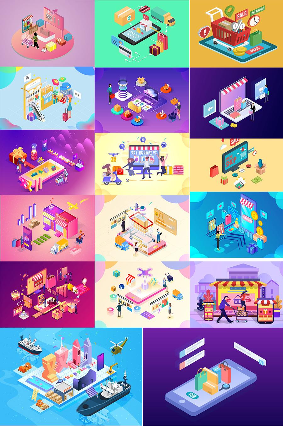 17款电商淘宝双11手机UI插图画购物banner广告毕业设计作品AI矢量分层素材