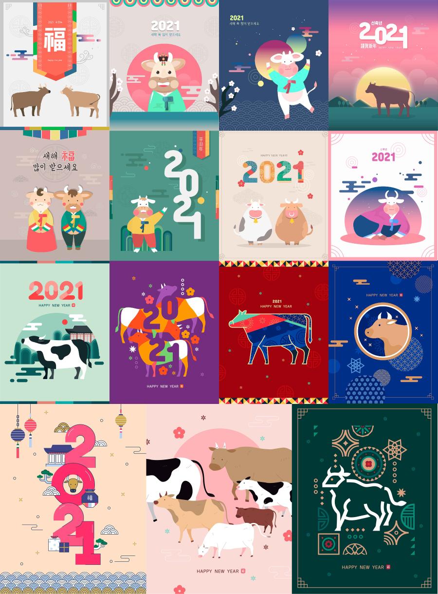 15款2021年牛年吉祥物新年元旦图案手绘卡通插图海报