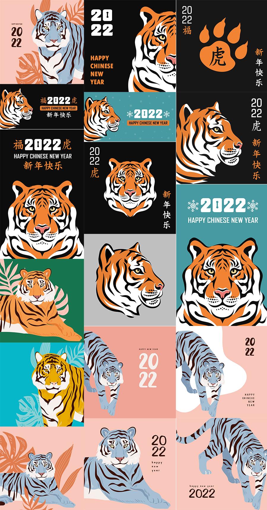 18款2022虎年新年春节卡通老虎形象元素插画海报模板AI矢量设计素材