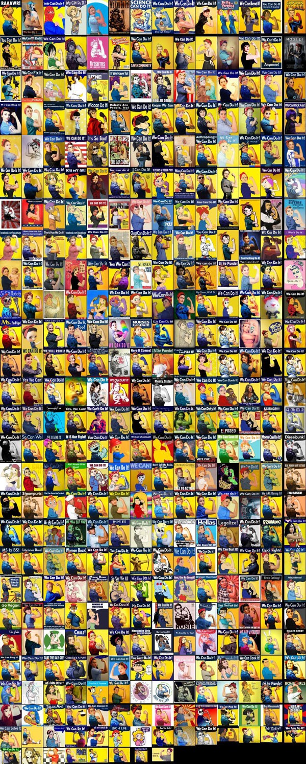 1943年,美国艺术家J. Howard Miller为Westinghouse设计了一幅海报,为了激励那些在战争年代从事军事服务的妇女们。这幅海报被命名为“铆工露斯”而为大众熟知,随后却被遗忘了很长一段时间。直到几年前,它以复兴形式的新版本重新出现在人们面前。如同病毒般,产生了大量副本,蔓延开来。据估计,目前在网上许有1000幅左右不同版本的海报在增长,每年10-20%的增长率。