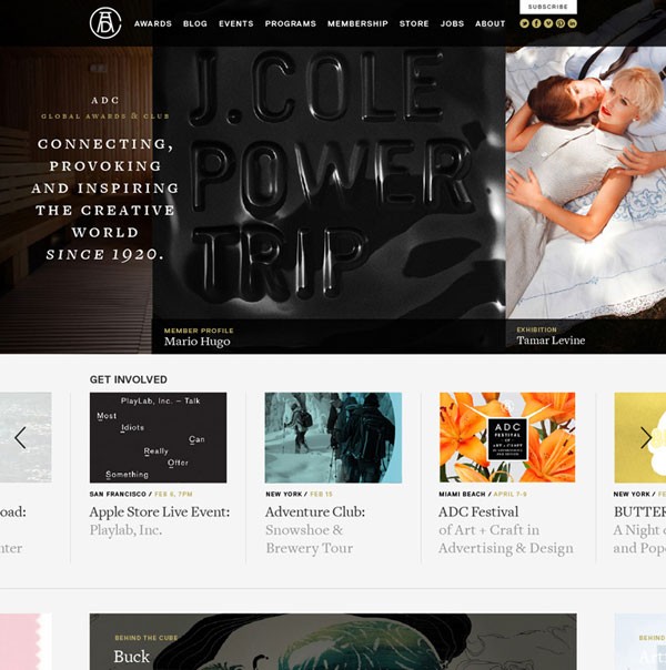 创立于1920年的 ADC 是世界最杰出的创意组织之一,每年举办的专业比赛享誉全球,2009年 ADC 公布了让人惊讶的全新视觉识别系统,Trollback 工作室的设计一反经典的传统标识,让业界很多专业人士难以接受,批评不断!在五年之后的2014年,ADC 董事会决定重新启用经典标识,在原有经典基础上做小幅度修改,这是在2002年Paula Scher(薛.博兰)设计的基础上修改的,把 C 放大,包围这个 AD,使整个视觉更加紧凑、统一,由加拿大创意机构 Sid Lee 完成。ADC Young Guns 板块则由 Franklyn 工作室完成。