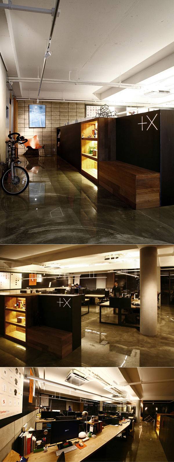 Plus X是韩国首尔的一家品牌创意公司。'+'和'x'被认为是最根本的标志。我们试图保持'+ X'的象征,排除使用不同的颜色。相反,采用黑色为主色调的中性色。我们的企业理念体现在色彩的运用。以图形为元素的独特的字体,影响了PLUS X总部室内设计,以及企业和员工ID卡。