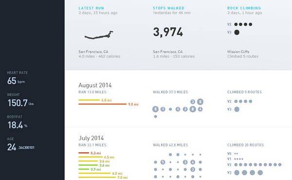 不可否认,这个网站(aprilzero)挺炫的,除了惊艳,带来的更多的是吸引力!不信?请看:网站上的这些数据,都来自Anand Sharma“手机上不同的应用”。跑步的步数、里程、时长、心跳次数、爬山的次数、吃玉米卷饼的次数、体脂率、年龄、体重等等——那些让人枯燥的数字,经过夏尔马的组合、美化,变得有吸引力起来:结合了每天的工作记录、图片记录,顿时给人非常不一样的体验,Anand Sharma把它称之为“混合式数字日记”。