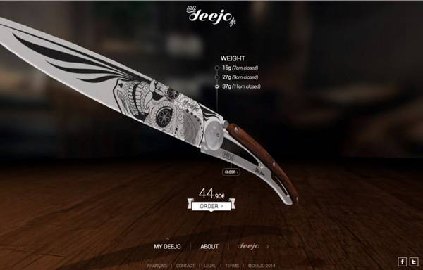 这是法国 Deejo 刀具推出的刀具在线定制网站,帮助你设计属于自己的 Deejo 刀具。这是一个基于 HTML5 的网站,使用 WebGL 技术渲染全3D的操作界面和质感逼真的刀具。