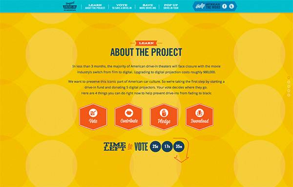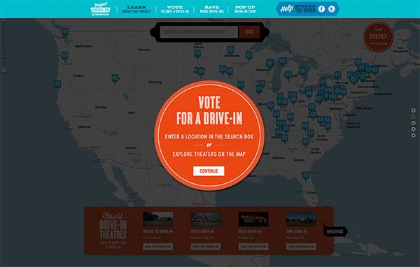 露天汽车影院是美国汽车文化的一部分,但目前由于各种经济原因很多影院面临被关闭的现状,这是一个公众投票建议网站,在这里公众可以尽微薄之力来帮助电影院复兴。整个网站设计简洁平面化,导向清楚,是一个具有实用性的网站。