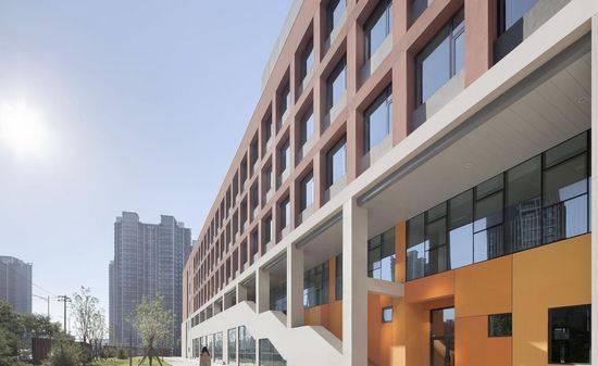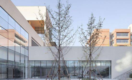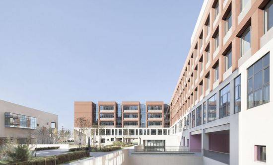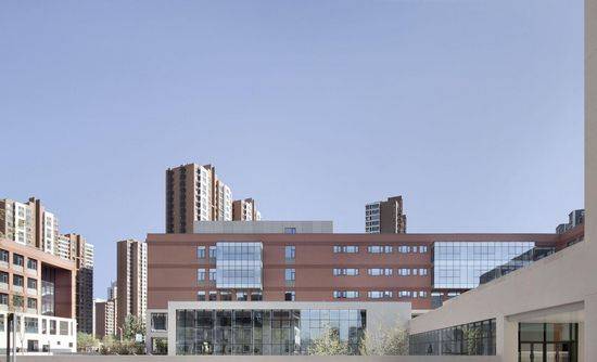 位于昌平区的回龙观镇,在北京北五环以外,161中学回龙观学校经过五年的设计和施工在2015年10月23日投入使用。作为一项重要的惠民工程,学校的建设不仅有助于在旧城区的人口向新城区迁移,而且也促进了郊区的发展。为了缩小城乡之间的教育差距,学校被认为是为居民提供高质量的教育服务。因此,设计理念应该符合当前教育的趋势,即更加开放和可持续。 庭院空间与各种实体功能相结合,如露天剧场、绿色花园、开放平台和共享走廊等。这些元素在校园中的核心区域共同工作。它们不仅丰富了空间层次,而且还鼓励人们在不同的活动、人与环境之间的多感官相互作用。