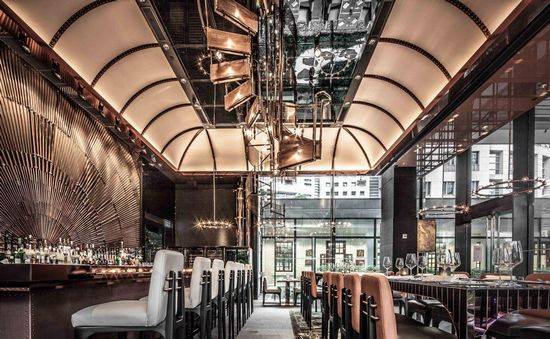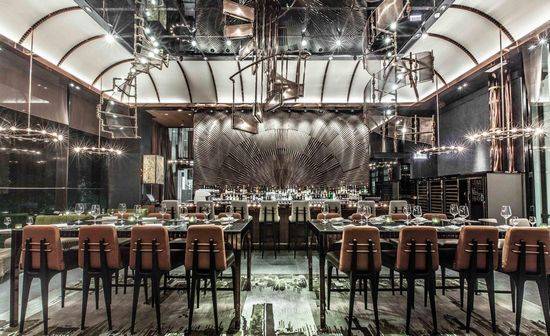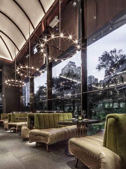 香港AMMO餐厅空间设计是由设计师Joyce Wang精心完成的,通过设计师别出心裁的巧思打造出一个充满复古机械而不失奢华的餐饮空间。整个空间装饰充满机械复古风格,空间的格调类似于一个超现代的军事博物馆,上部设有堡般高高的天花板,充满军事和工业感的机械冰冷凌厉,为了缓和这种气息设计师用皮革、天鹅绒和丝绸这样柔软的材质抵消锋芒毕露的金属感,吊灯的色调营造出几许温馨之感。餐厅周围郁郁葱葱的类似于热带植被样的设计很是别致,创造出不一样的就餐环境。