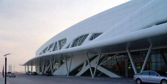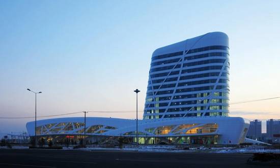 大庆公路客运交通枢纽在世纪大道和龙凤街之间的交叉点。建筑主体包括一幢三层的车站,一个十四层楼信息中心,它们和谐的连接在一起。整个项目建筑面积近30000平方米,设计是在2009年初,在2010年底完成。 大庆市以中国最大的石油城市而闻名,它位于北部高山地带,具有很大的地理特征。在这种情况下我们试图突破传统的交通建设模式,并给出了客运大楼一些文化内涵。所以建筑的形状来自冰雪文化,考虑东北多雪的地形特征,白色形状布置,像冬天的山站在地球之上,体现出美丽的轮廓。建筑立面形式的细节如分支与钢结构,所以丰富立面的水平,也加强了设计概念。客运站的室内空间凸显了开放和透明的感觉,有一幢三层楼的大厅,每个空间的功能连接,提供一个良好的流线和伟大的观点。