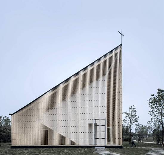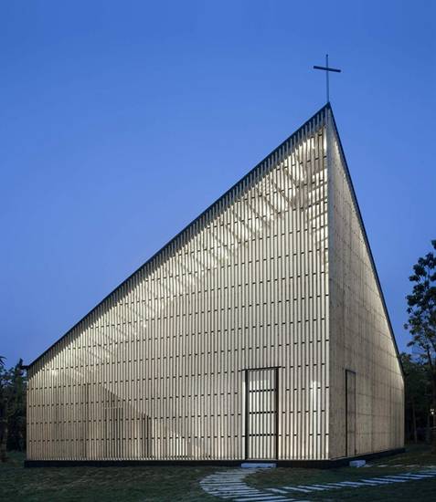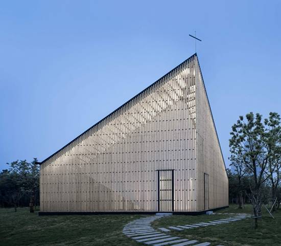 在南京黄浦江的万景花园有一座200平方米的小教堂。由南京协和神学院的牧师主持,它支持宗教崇拜和婚礼服务等活动。这种钢木结构教堂使温和的外部形态以及强大的内部空间充满了神秘的宗教力量。质朴的材料表达不出微妙的建构逻辑。 万景花园教堂的设计,建筑师没有全权反对经典空间次序的“集中式”和“深度”。从平面图看,建筑拥有一个八角形中央大厅,四周围绕方形走廊。立面图中,屋顶形态和狭长天窗的作用扩张了空间进深,也强调了神圣空间上方轴线交汇的至高点。
