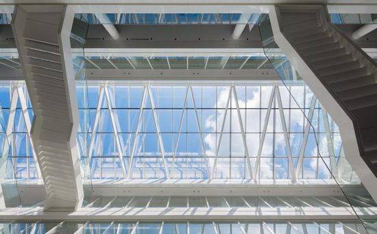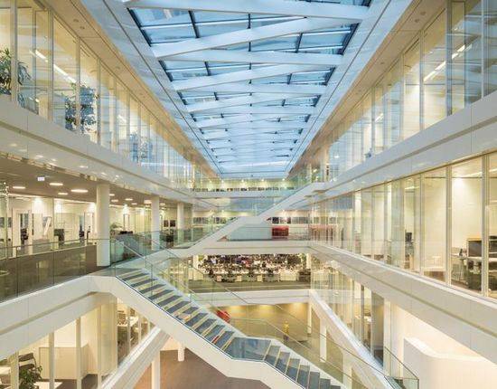 德国公共事业公司Trianel最近搬进了位于亚琛市的新总部,而之前这家公司分布于三个不同地方。该建筑由gmp architekten事务所设计,设计方案是源于2012年获胜的一次竞赛。为了寻求更好的通透性和交互性,建筑为超过300名员工提供了6300平米的建筑空间,总共将能容纳最多430名员工。建筑外立面的玻璃严格地呈水平方向拼接,其上下由加厚的楼板与连续的遮阳百叶窗相辅相成。公司的中庭带有天窗,宽敞而明亮,因此,各种活动都围绕着中庭举行。这里设有任意走向的楼梯,可以使人们直接往返于楼层和部门之间。