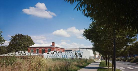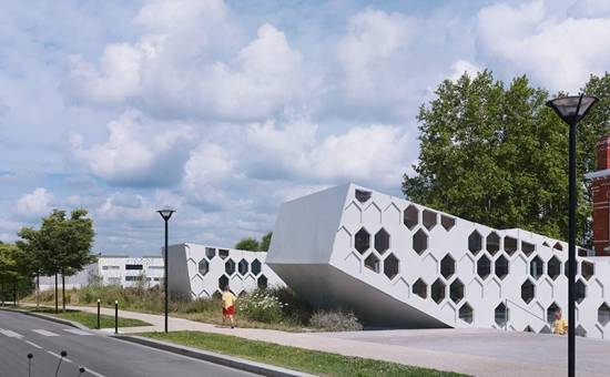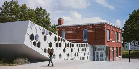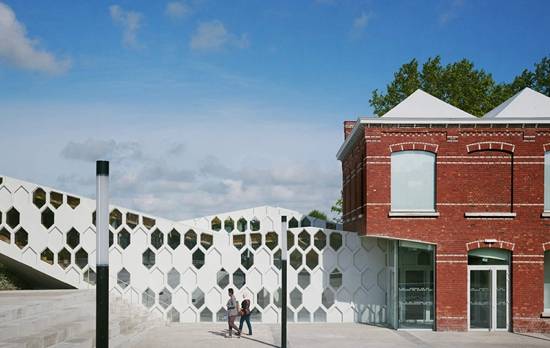 该建筑的占地面积为900平方米,该项目是对原有旧纺织厂的砖房进行改造和翻新,同时又扩建了一个倾斜而出的结构,紧贴着砖房的立面。