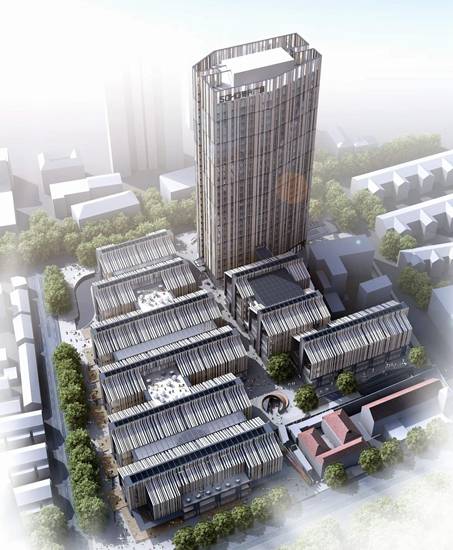 SOHO复兴广场位居上海内环的中心——繁华的淮海中路CBD商圈。项目占地20,084平方米,包含约7.2万平米的地上面积及6.5万平米的地下面积,规划总建筑面积为137,436平米,由一栋27层的办公楼和4座裙楼构成,集5A甲级办公空间和商业配套于一体。