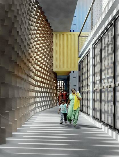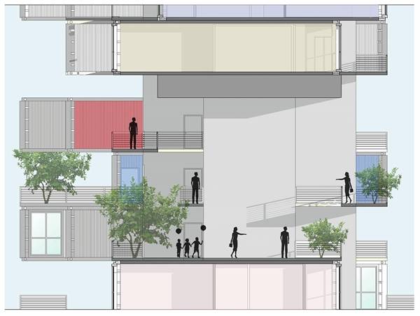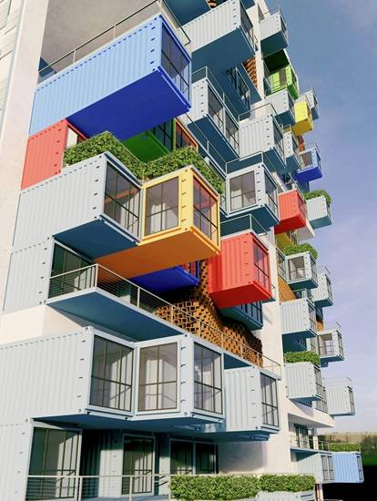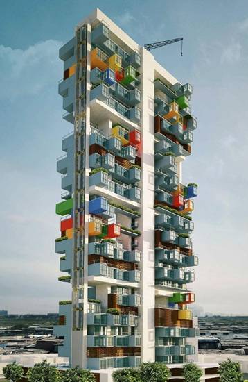 该项目是由Ganti + Asociates (GA)Design Consultants设计的,这是一个集装箱摩天大楼,该方案赢得了国际创意大赛。该方案设想为孟买人口过剩的达拉维贫民窟提供临时住房。鉴于考虑没有任何额外的支撑下,钢制集装箱可以堆叠10层楼高,该建筑高达100米,由一系列的自负载集装箱群组成,每八层则设钢梁以划分。
