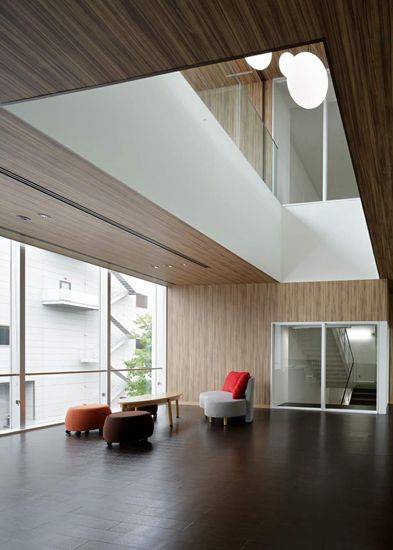 树林办公室——它被茂盛的树木围绕着,呈现出又舒适又清新绿色的自然环境。树林像立面一样覆盖着办公室立面,被称为“SONG WALL”。 建筑的外墙是以柔和、亲切的外观建造的:工厂周围外观的特性就像森林一样。SONG WALL代表:S =阳光(控制光),O=开放(自由观),N=自然(与自然连接),G=树丛立面(被树木包围)。办公区是开放绿色的空间,这里没有陈列的桌椅,给工人们一种自由感。室内充满了森林的颜色,每个颜色都有自己的效果,颜色帮助人们转变他们的心情。