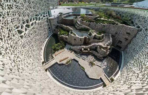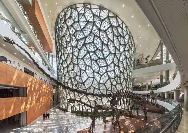 这栋建筑包括展览空间、一个4D剧院、一个户外展览花园和一个30米高的天井,欢迎着参观者,引人注目的玻璃墙上有着动植物图案的多孔结构,充足的自然光线透过玻璃墙照射进来。