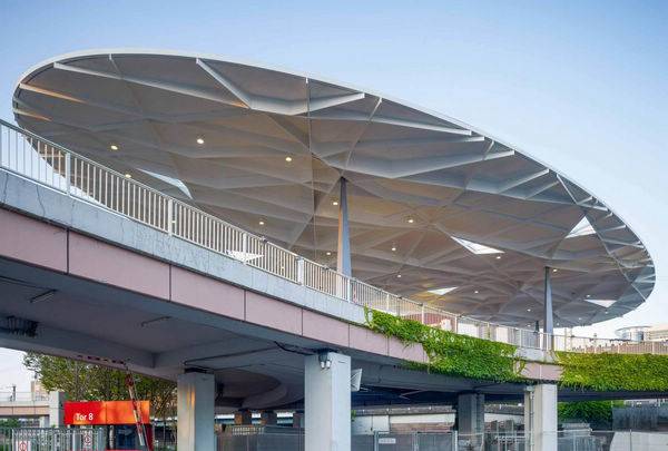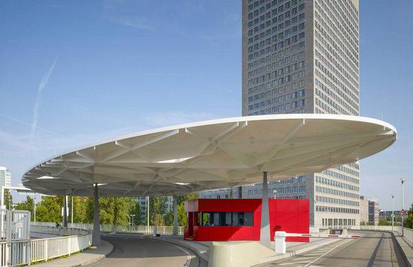 德国法兰克福博览会是由Ingo Schrader Architekt设计的,该项目的设计获得了德国设计协会颁发的2014年形象奖。法兰克福博览会的正门上方是高高悬挂的白色椭圆形屋顶,创建了一个城市门户地标景观。卵形的造型与建筑的方形形成对比,并凸显了正门多样的方向性地位。