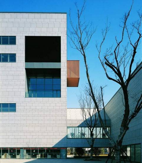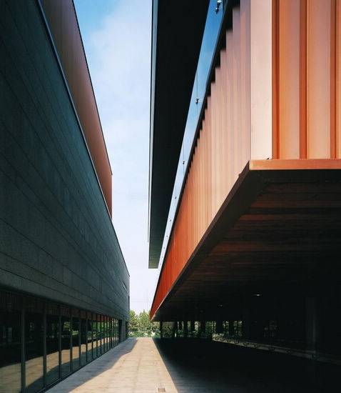 安亭镇文体活动中心基地位于安亭镇区北部、是一块临河的三角形不规则场地.西侧紧靠镇区最主要的南北向干道。周围基本都是厂房和仓库,西北角临近一处大型超市。它处在上海郊区平庸而又易变的工业景观之中,前身就是一所工厂。由于众多户外活动场地的配置要求,使基地的可建部分略显局促。 为了保持相对独立的不同的内部使用,简化空间复杂性和减少外形尺寸,整个建筑分为四个独立的体积。这四个体积的大小都是不同的,包括游泳馆、健身房、文化中心和电影院,被安排在道路边的网站从东北向西南在锯齿模式。一个半封闭的入口行人广场在西侧面临主要道路。因为多数的主要空间是位于二楼,四个体积是联系在一起的一个高架紧凑的公共平台。这个平台可以自由访问通过广泛的坡道在西部和北部。在平台的配套设施如小餐馆、咖啡馆、商店、健身房间和停车场。
