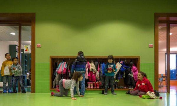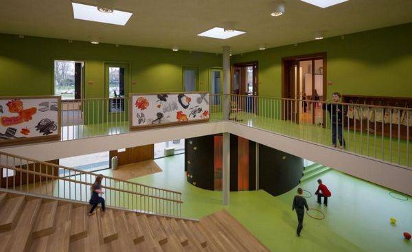 学校提供小学适应教育教学的形式:一个光亮、宽敞的中央大厅。这种明确的空间设置,纯流通的范围可以被保持在最低限度,而可用的公用空间最大程度是多功能的。大楼梯,完全用木头包,不仅是一个点的高差,但也是一个公共论坛与游乐区,因此也可以作为一个戏剧舞台。