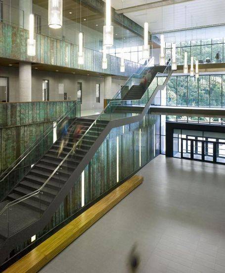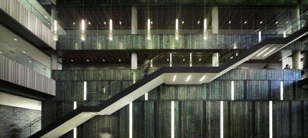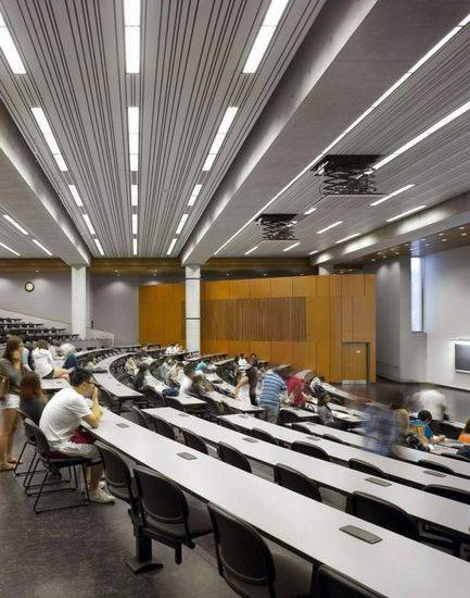 多伦多大学密西沙加的教学中心提出了新的可能性,社会和智力的参与,无论是在课堂上还是其它方面。该中心的豪华材料,智能教室,邀请公众场所和环境特征表明多伦多的加强的教育经验,鼓舞人心的架构和可持续发展的原则,增加学生、教师职员和游客的快乐和幸福。 校园的教室空间增加了50%,教学中心提供的不同类型和尺寸,包括500个座位和350个座位的演讲厅,以及一系列的智能教室,支持协作和项目为基础的学习的教学空间。户外座位,增加了聚会和娱乐的路径和空间出现直接流入建筑的室内休息室,诱人的学生享受校园生活。铜包层还继续从外部导入的主要内部,进一步强调了校园和建筑物之间的连接。