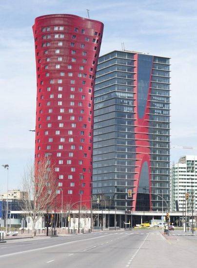 这个项目包含两个不同用途的塔楼,从事一个微妙的连接。尽管在形式上两个建筑形成鲜明的对比,但建筑之间的关系和谐而互补。建筑(每个110米高)具有高度象征性的角色,像他们致敬站在历史的威尼斯塔在西班牙巴塞罗那入口广场会展中心附近。 酒店大楼(GF+25)*的设计采用有机的形式和似乎变化作为一个围绕它。考虑到建筑的几何复杂性,立面分为两个表面。内在的表面是一个密封的整体基于光与铝和玻璃幕墙解决面板设计完全符合所有声、热、密封要求。外立面作为第二表面,提供纹理和容纳大楼的变量几何。表面是由独立的铝管的末端连接到球窝关节允许所需的扭力。