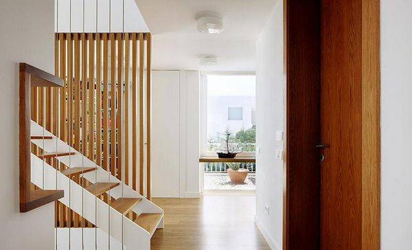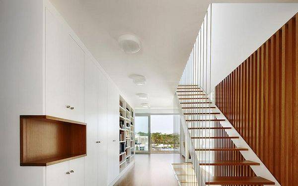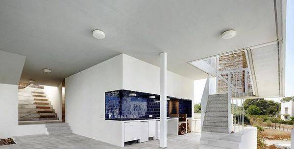 该住宅位于沿海区,占地约1000平方米,其中从公路到此处是陡峭的斜坡,景色很美,但和太阳方位不匹配。住宅在该场地的顶部,旁边的访问释放了一个花园区的海景。四个独立的空间--露台、干燥区、小操场、花园式庭院,穿透紧凑的体积,它们提供交叉通风和最佳的日照自然照明,最大程度的利用斜坡来定位一个地下室,包括起居室、厨房和一系列的房间,构成“避暑住宅”链接到水池,而第一层和第二层符合“冬季住宅”,它们两个通过两个楼梯相连。