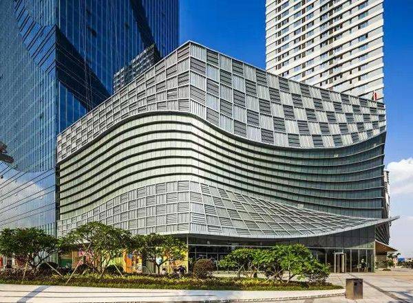 南海万达广场的巨大体量和高度必将成为广佛连接处的地标性建筑和空间景观,对于这一设计课题,外立面方案设计力求表达一种欢乐与升腾的意向,希望以此与项目本身的特点符合,同时提升该区域的形象。为表现这一构思,设计创意采用了花与飘带的意向。广佛地区素称花城,飘带的加入加强了欢乐与升腾感的表达,这一意向同时暗合了地区的隐性文化。