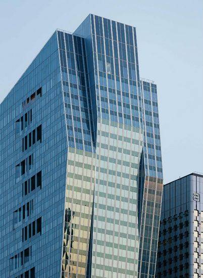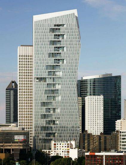 这个办公楼突出的是铰接式三个各具特色的面板。39层楼,高195米。我们设计建筑立面三条不同的厚度,设计整体形成了多样性和唯一性。连接滨海艺术中心和新花园。 “双皮肤”立面展现许多优点:办公室充分获得自然光,但他们也通过一个集成的遮阳系统保护。减少照明和空调的能耗。立面的材料:玻璃窗框和基石,和铝细木工和不透明的组件的外观。在南边,凉廊和植物使用玻璃板条。这些凉廊形成凹陷的外观,每一个凹进去的点都与建筑立面形成光滑对比。阳台和凉廊,经常与国内建设相关,是一个三级建筑外观。这些空间给员工提供自由的空气并且能享受户外的感觉。