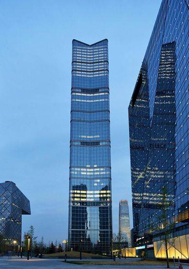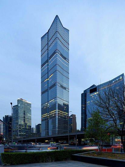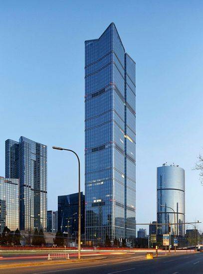 该项目是由P&T Group设计的,位于北京CBD核心区域的第三环中路,与国贸三期、CCTV总部共同组成CBD黄金三角,这个新甲级办公大楼是最后一个财富广场组件。完成的开发项目包含办公室、公寓、5星级酒店和零售。该项目将成为北京第二高楼,在2014年完成,共60层高267米,在这个黄金位置提供优越的办公环境。 设置在一个大的和广泛的景观公园,它通过在地面以下的零售商场与地铁,在宽敞的门厅上层是150000平方米的办公空间。该塔在形式、配置和节点上承认并回应现有建筑的设计倾向于立面平板劲儿弯曲的转角,但它是成比例的,明确和细化,反映其重要性。完整的幕墙设有铰接式散热片,所有成品银彩色铝反射玻璃,在双层玻璃单元,使塔楼的外观整洁而优雅。