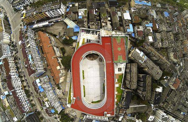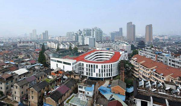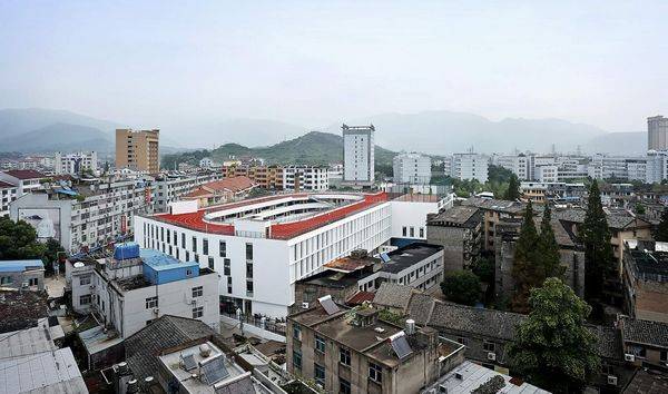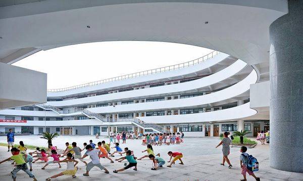 天台县第二小学是一个独特的设计项目,该学校将作为一个模范学校,为小学生的知识培养、艺术、道德、健身提供了一个优美的环境,该项目有效地解决了在老城区土地不足的问题。 200米的操场跑道要占用40%的土地,这样校园空间就非常的小,然而操场也是必不可少的,由于土地缺失,我们将200米的跑道放到屋顶上,从而为学校在地面上赢得了额外的3000平方米的公共空间。由于跑道在屋顶,所以该项目的要求层数是4层,和周边的建筑创造一个更和谐的关系,为了提供更多可用的绿色庭院空间,建筑体块旋转至与场地边界线成十五度角,从而在建筑外部与场地边界之间创造了多个小广场空间。