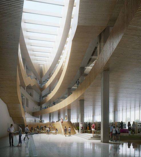 经过两年的社区参与,Snohetta和DIALOG已经赢得了他们在卡尔加里新的中央图书馆最终的比赛设计。该项目地点位于卡尔加里市中心和东村之间的一个交叉口,新图书馆旨在满足一个创新的、技术先进的公共空间,研究和合作的城市愿景。 Snohetta的设计灵感来自附近的山麓小丘,在现有的轻轨运输线交叉部位,创造一个阶梯地形。该大楼的电梯在它的中间部分形成拱形,它作为一个新的公共广场而且能直接让行人通过。