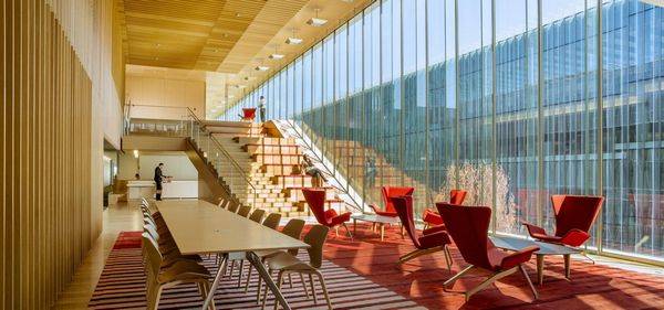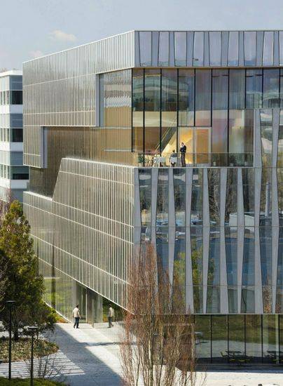 大楼335是一座140000平方英尺的办公大楼,该项目是位于诺华公司的北美总部肿瘤学的办公楼。下边五层的开放式办公工作区连接一个螺旋上升的管理区。采用木饰面和透明的玻璃,大跨度的无柱结构,管理区是一个公共场所,让不同的项目小组进行相互交流。主要工作领域是公开的,配置为最大的灵活性和跨学科协作。透明的玻璃幕墙,反映了协同工作的一个创新的典范。