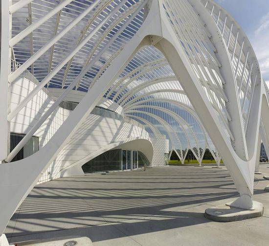 佛罗里达理工学院科学创新技术教学楼是由Santiago Calatrava设计的。该建筑是学院新校区第一楼,位于校园中央湖泊的西北面,高出周边自然生长的橡树。这个标志性建筑,可以从4号州际公路、波尔克公园车道和校园南入口望到。一个椭圆形的车载环路,两旁的高大的棕榈树,使车辆进入学校的核心道路。 该建筑的核心功能是课室与实验室,它们围绕这两个弧形的弯道,双通道。周边的房间布置了非技术性的教学实验室,拥有充足的自然光线和宽阔的湖景。建筑内部布置科学研究实验室,以将重型机械系统布置在建筑内部。走廊净高两层,上设有玻璃天窗。二层的教师办公室可以俯瞰走廊,同时透过天窗欣赏校园风景。教师办公室及行政办公室以“共享”为设计理念,大型多用功能厅设有中央天窗,光线明亮,可满足讲座、表演、仪式、示威活动、筹款活动、正式晚宴和舞蹈表演等多种活动,也可作为展览、招聘会,甚至是学生学习室。该建筑促进不同学科的学生与教师执教的交流。