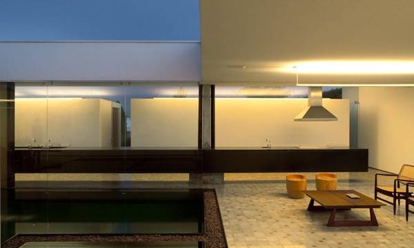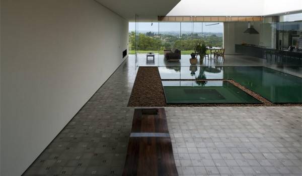 Sao Roque住宅以两个约束条件为基础:它充分利用南部平均20%的坡度,建成一个单层的住宅。院子、地板和水都应该位于相同的水平面。该结构以间隔12米的两大支柱为基础,在中心支撑着一个90厘米高的梁,然后向两端逐渐减少的20厘米高,其每个4米长的悬臂都超出了支柱。