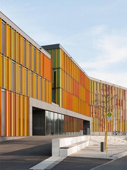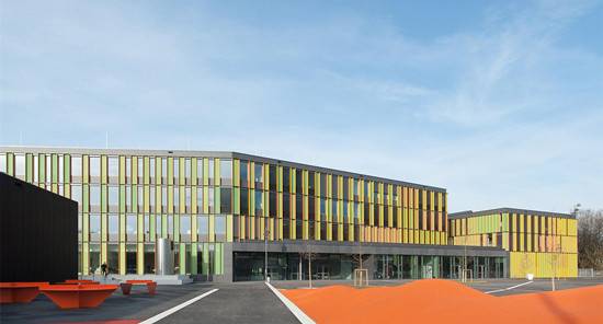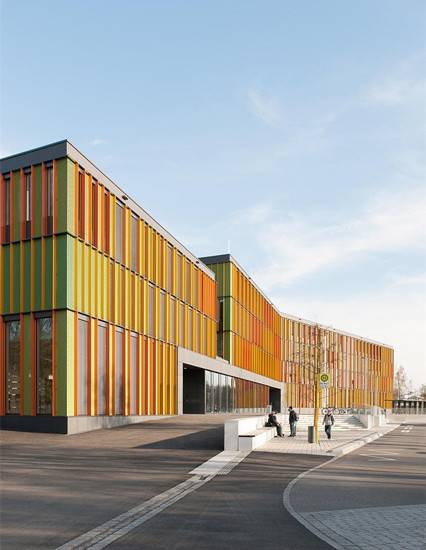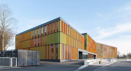 该项目是由Lanz Schwager Architekten设计的,设计团队于2010年获得该学校的设计竞赛。Biberach学习中心的主要设计理念有两点:沿着教学区的建筑空间布局,以及作为“空间景观”的交通流线区的室内空间造型。新学校布置在场地西部,绿地通廊与河流走向平行。从入口大厅进入校园,学生短程经过礼堂、食堂及其他功能区。中间区域不仅能从水平方向观察全景,还能在所有楼层获得竖向性的开放感。